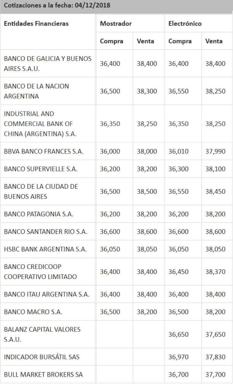 Con respecto a otras entidades bancarias, algunas ofrecieron por encima del BCRA. Santander Río fue el que más alto lo cotizó a $38,60; mientras que Superville y Macro lo hizo para la compra a $38,20.