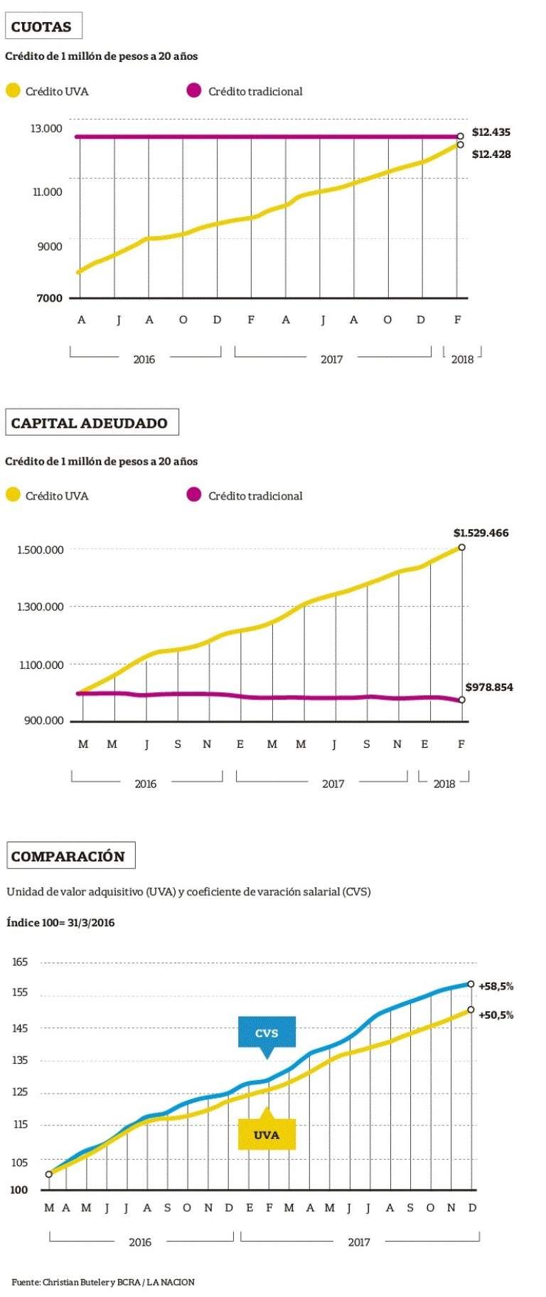 La saga, denominada "Crédito Tradicional vs. Crédito UVA", es un ejercicio teórico que consiste en comparar cómo le fue a quien obtuvo hace dos años un crédito hipotecario del Banco Nación por un millón de pesos a 20 años (240 cuotas) en función de si eligió hacerlo por el método tradicional (sistema francés, con tasa fija del 14% por tres años y luego variable) u optó por hacerlo con ajuste UVA a igual plazo desde el inicio. "La comparación toma el crédito que ofrecía en este último caso el Santander-Río, que era UVA+6,95%, porque el Nación no tenía a 20 años entonces", aclara Buteler.