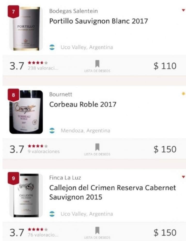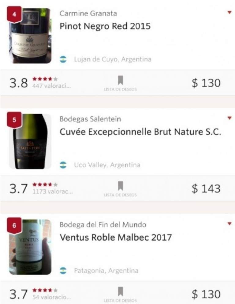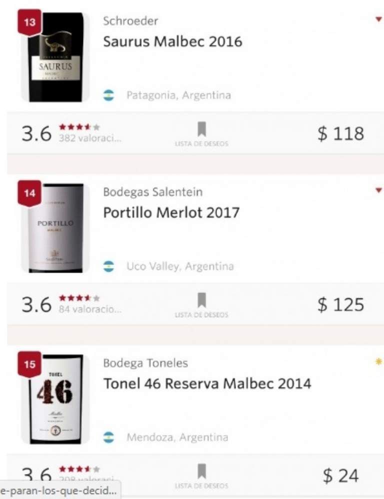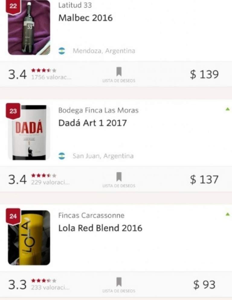Además realizan estos rankings de precios y calidades que actualizan cada semana. En esta lista llama la atención la aparición de un vino a $24 cuando en este rango es imposible encontrar una botella de varietal ese valor. Cosas de la tecnología.