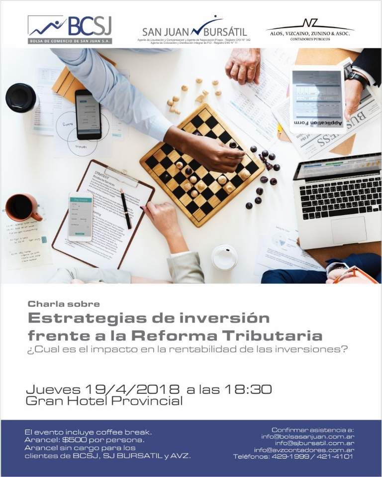 La Bolsa de Comercio de San Juan realizará una la charla junto a San Juan Bursátil y AVZ: Estrategias de inversión frente a la reforma tributaria. Se realizará el jueves 19 a las 18,30, en el Gran Hotel Provincial.