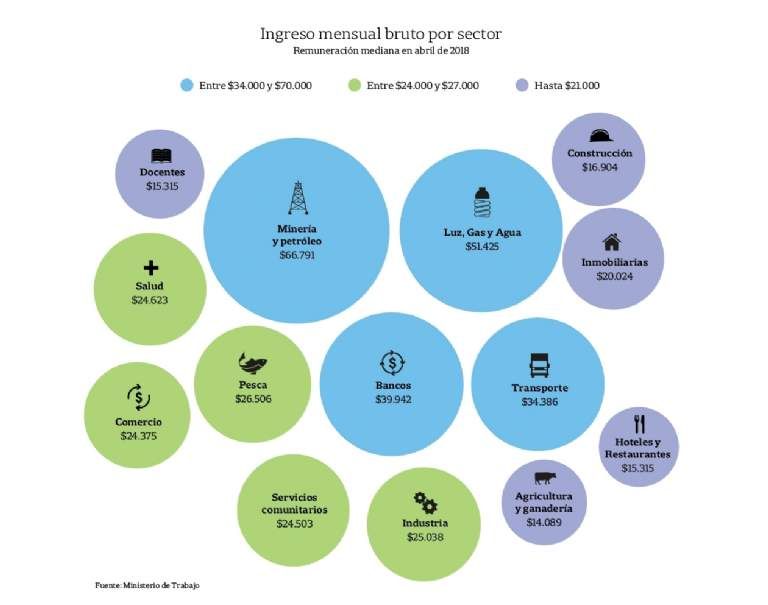 En contrapartida, los trabajadores que menos ganan son los que se desempeñan en hoteles y restaurantes, donde el ingreso es de $12.337, y agricultura, ganadería, caza y silvicultura, que se encuentra en $14.089. Luego están los trabajadores de enseñanza, cuyo sueldo promedio es de $15.315.