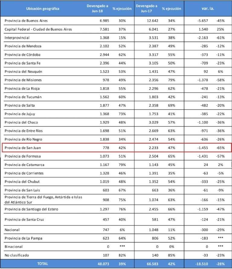 Un informe de la Asociación Argentina de Presupuesto aseguró que San Juan fue la provincia que sufrió la baja más brusca de transferencias desde Nación. Según el texto, en 2017 el gobierno nacional giró $2233 millones a la provincia, mientras que durante este año enviaron $778 millones.