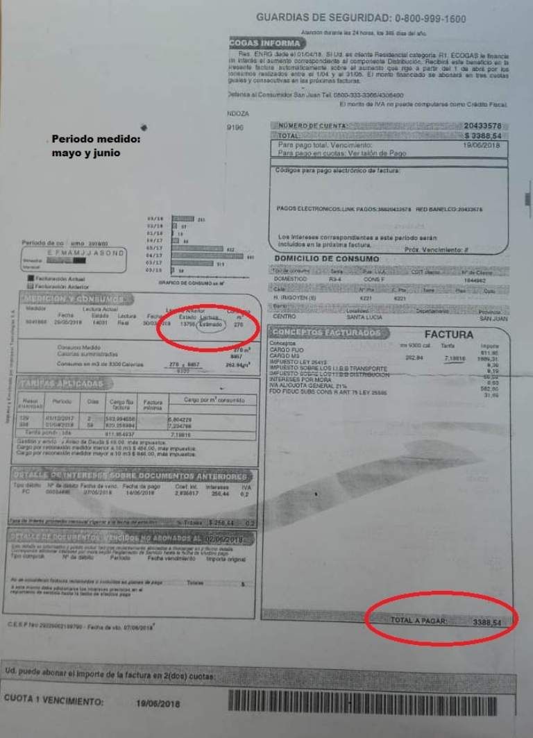 En este marco, hay que mirar la factura y ver qué están cobrando desde Ecogas. Si dice ESTIMADO en el apartado de consumo que figura a la izquierda de la boleta, hay que hacer la denuncia porque estiman en lugar de cobrar el consumo real.
