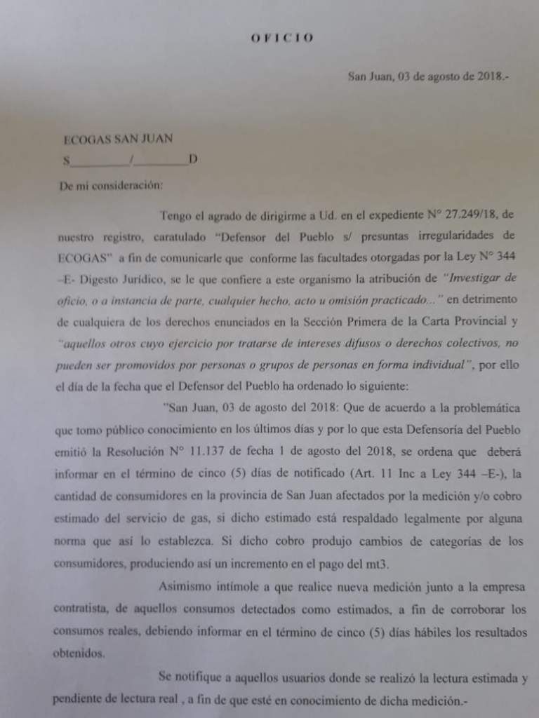 El capítulo por las boletas del gas tuvo un nuevo capítulo este viernes en favor de los consumidores: la Defensoría del Pueblo envió un oficio a Ecogas en el que, entre otras cosas, le intima a realizar mediciones reales del consumo de sus clientes y a brindarles la información de la manera más adecuada.