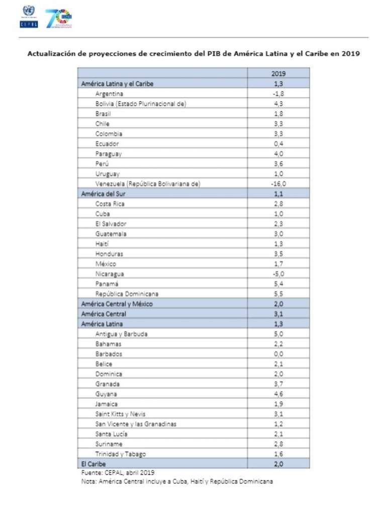 La Comisión Económica para América Latina y el Caribe (CEPAL)actualizó sus proyecciones de crecimiento de la actividad económica para los países de América Latina durante 2019, rebajando su estimación para el promedio regional a un 1,3%, comparado con el 1,7% previsto en diciembre 2018.