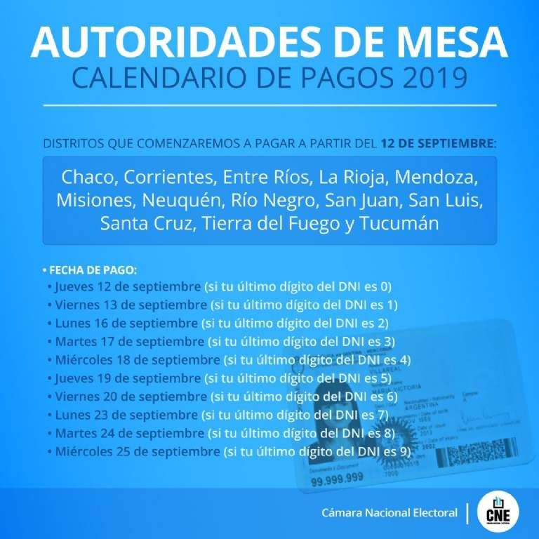 La Cámara Nacional Electoral informó que este 12 de septiembre habilitarán el cronograma de pagos a las autoridades de mesa de las últimas elecciones primarias en trece distritos, entre los que se encuentra incluido San Juan.