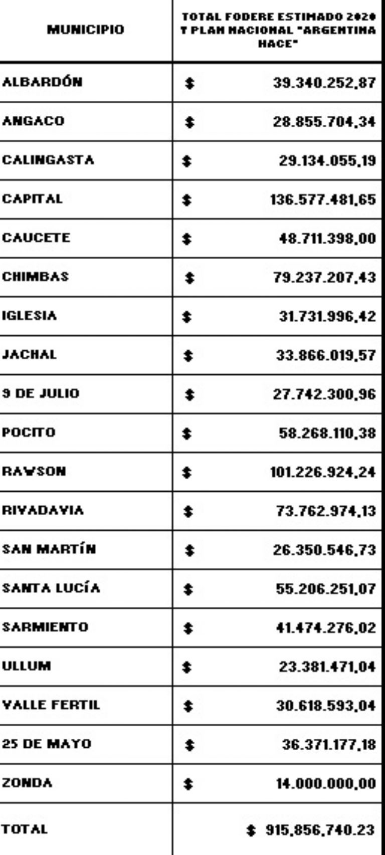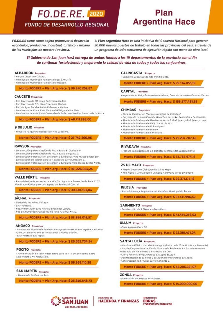 Como los fondos nacionales se inscriben en un convenio firmado entre Uñac y el ministro de Obras nacional Gabriel Katopodis, por $1.500 millones, se les dan ahora 500 millones de Argentina Hace para que los municipios ejecuten sus obras, pero hay 1.000 millones más que se destinarán a las comunas por proyectos que manejarán en conjunto con la provincia, a través del Ministerio local.