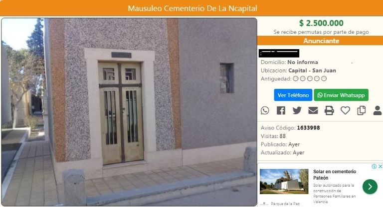 En un día la publicación tuvo casi 100 vistas. En cuanto al precio de los nichos en el cementerio de la Capital, los valores varían pero llegan a los $90.000.