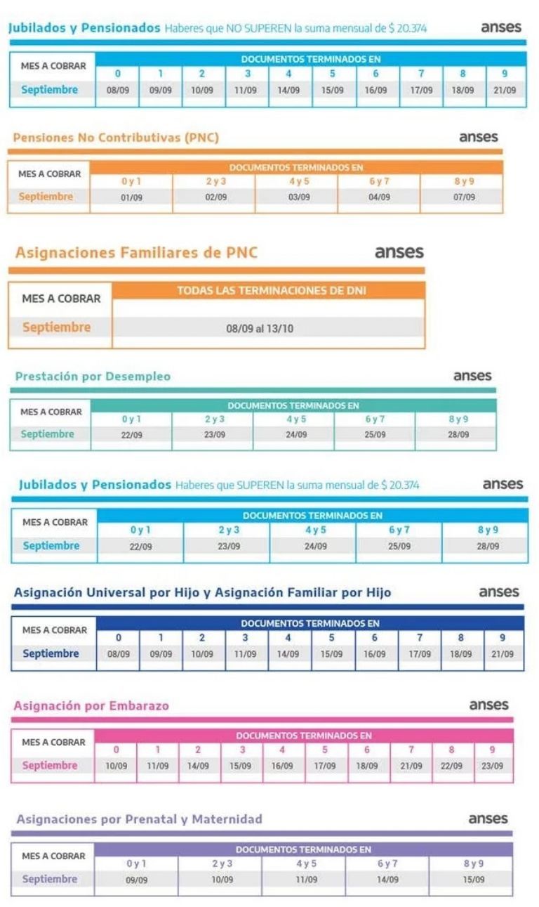 De cara al inicio de septiembre, la Anses informó los calendarios de pago para jubilados y pensionados, Pensiones No Contributivas, beneficiarios de la Asignación Universal por Hijo y por Embarazo, de la Prestación por Desempleo y Asignaciones Familiares y de Pago Único (Matrimonio, Nacimiento y Adopción). También está estipulado el turno de cobro de las personas alcanzadas por el Ingreso Familiar de Emergencia (IFE).