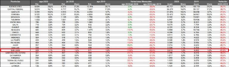 La provincia de San Juan ha tenido una gran caída en las ventas de autos 0km este último año. En comparación con agosto de 2019 tuvo una baja del 42,4%, según dijeron los registros de la ACARA (Concesionarios Oficiales de Automotores en la República Argentina). Además, la provincia en tan solo un mes tuvo la baja del 11.8%.