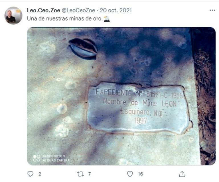 Generación Zoe, la empresa de Leonardo Cositorto, ofrecía a sus seguidores invertir en la criptomoneda Zoe, respaldada en minas de oro ubicadas en Jujuy y San Juan. El 19 de octubre el coach cordobés publicó un tuit en el que informaba que iniciaron las excavaciones en la mina León para empezar la extracción de oro. “Dejando nuestra bandera en San Juan”, posteó.