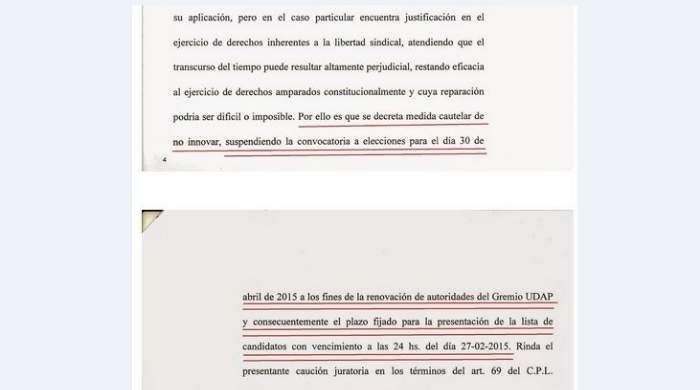 El 30 de abril estaba previsto que hubiera elecciones en UDAP, pero tras la expulsión del sindicato de 9 afiliados de la agrupación Unidad Docente y una presentación en la Justicia los comicios quedaron en suspenso. La jueza María Rodríguez de Flores le hizo lugar al recurso de amparo presentado por los expulsados y tomó la decisión de paralizar el recambio hasta nuevo aviso. La determinación judicial pone en jaque a las elecciones en el gremio porque podría haber hasta un cambio en las listas si UDAP tiene que reincorporar a los expulsados.