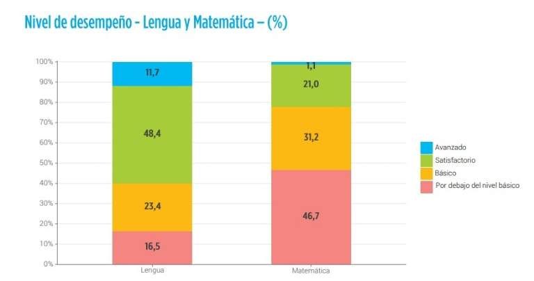 En lo que más flojos están los estudiantes es en Matemáticas, espacio curricular en el que el 46,7% de los alumnos de secundaria no alcanzó niveles de conocimiento básicos. Sólo el 22,1% de los chicos tuvo un desempeño alto o satisfactorio.