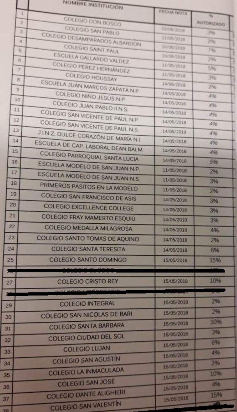 Según dijo la titular de Educación Privada del Ministerio de Educación, Nancy Mestre, en marzo las paritarias establecieron que se aplicaría un aumento en la cuota de hasta 12 % desde ese mes y otro del 5 % en agosto. Luego, el 16 de abril, salió una disposición firmada por el ministro Felipe de los Ríos que fijó que aquellos colegios que necesitaran, podían presentar carpetas pidiendo poder aplicar un aumento excepcional, por fuera de la paritaria, argumentando con gastos bajo declaración jurada. Hicieron presentaciones 40 establecimientos y se les concedió la autorización a 37 de los solicitantes, lo que representa un 20 % del total de los colegios privados en San Juan. El aumento está autorizado desde este mes y una escuela no puede juntar el aumento en agosto porque se iría en contra de la paritaria, es decir que lo tienen que empezar a implementar antes, por eso se autorizó desde junio.