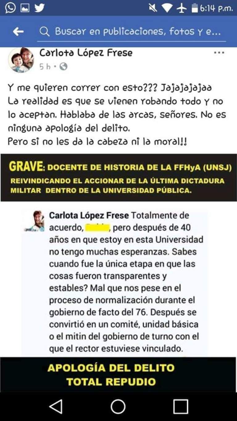 Un verdadero revuelo se generó en las redes tras un comentario vertido por la docente de la UNSJ Carlota López Frese, quien en su cuenta de Facebook reivindicó el accionar de la última dictadura militar. El episodio se da en medio de diferentes actividades de protesta en la casa de altos estudios por el ajuste de la gestión macrista y en defensa de la universidad pública en San Juan. El posteo de la docente cayó mal en el ámbito universitario y recibió el repudio de la Federación Universitaria de San Juan y de la La Agrupación Docente “Celeste y Blanca” que agrupa docentes e investigadores de la Facultad de Filosofía, donde da clases de Historia la cuestionada profesora.