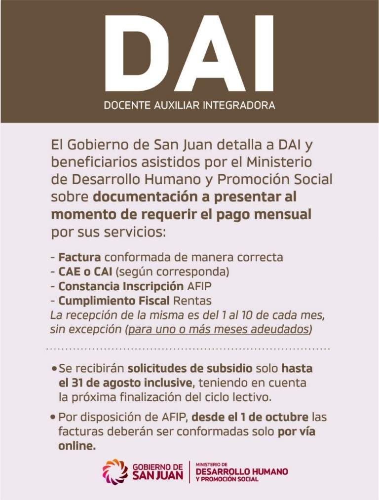 El Gobierno de San Juan detalla a DAI y beneficiarios asistidos por el Ministerio de Desarrollo Humano y Promoción Social sobre la documentación a presentar al momento de requerir el pago mensual por sus servicios: