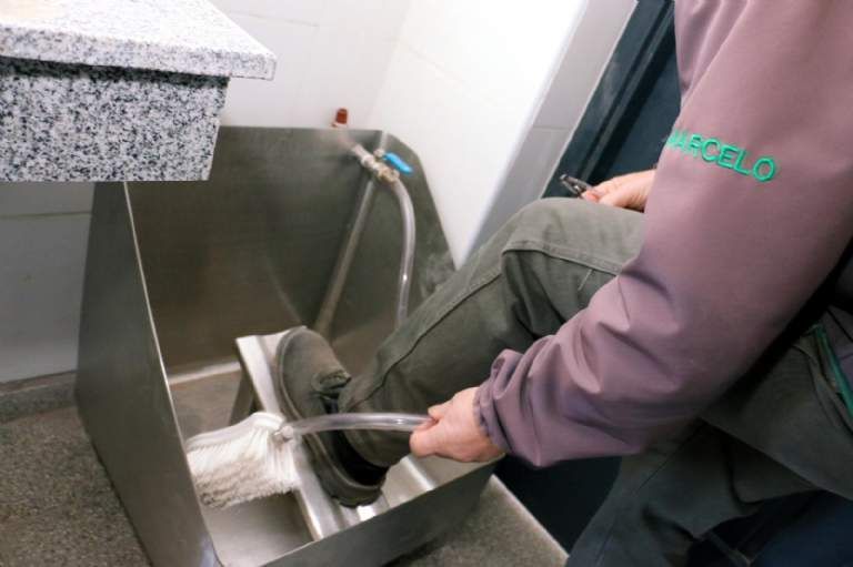 Un lavador especial de ojos es uno de las herramientas que más llama la atención en el sector de Faenamiento. Según explicó el profesor Marcelo Trotta, encargado de esta cátedra, el pelo del cerdo, especialmente, es muy fino y es habitual que se meta en los ojos de los que estén realizando la tarea.