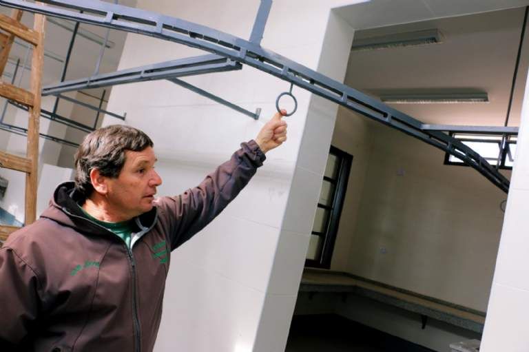 El edificio de Faenamiento cuenta con un circuito de rieles aéreos que permite una mayor comodidad en el traslado del animal desde que ingresa hasta que es es depositado en la cámara frigorífica.