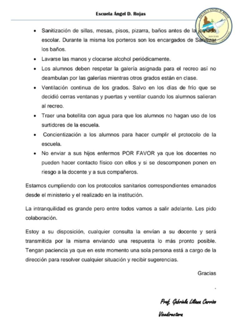 En el escrito, firmado por la vicedirectora, informaron que la directora de la institución y su secretaria contrajeron el virus, pero que no suspenderán las clases debido a que no asisten al establecimiento desde el pasado viernes y no han tenido contacto con nadie de la escuela. Sin embargo, aquellos padres que no quieran mandar a sus hijos a clases podrán no hacerlo y sólo deberán justificar la falta con una nota.