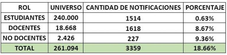 El programa Cuidar Escuelas monitoreó los contagios de estudiantes, docentes y no docentes, y demostró que las instituciones educativas son ámbitos seguros. Según las cifras oficiales, el porcentaje total de contagios en las escuelas sanjuaninas de marzo a agosto de este año es de 3.359, lo que representa un 18,66%. Donde hubo más casos de COVID fue en el sector de no docentes, con un 9.36% (227 casos en un universo de 2.426); seguidos por los docentes entre los que se reportaron 1.618 casos en un universo de 18.668 (8,67%); y los contagios entre estudiantes fueron 1.514 (0,63% en un universo de 240.000).