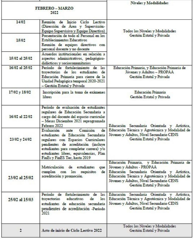 El Ministerio de Educación ya definió el Calendario Escolar Provincial para las instituciones educativas dependientes de la cartera, que regirá para el Ciclo Lectivo 2022, que arranca con la presentación de los educadores en las instituciones escolares el lunes 14 de febrero, mientras que el miércoles 16 comenzará el fortalecimiento de las trayectorias escolares de los estudiantes y el 2 de marzo será el inicio del Ciclo Lectivo.