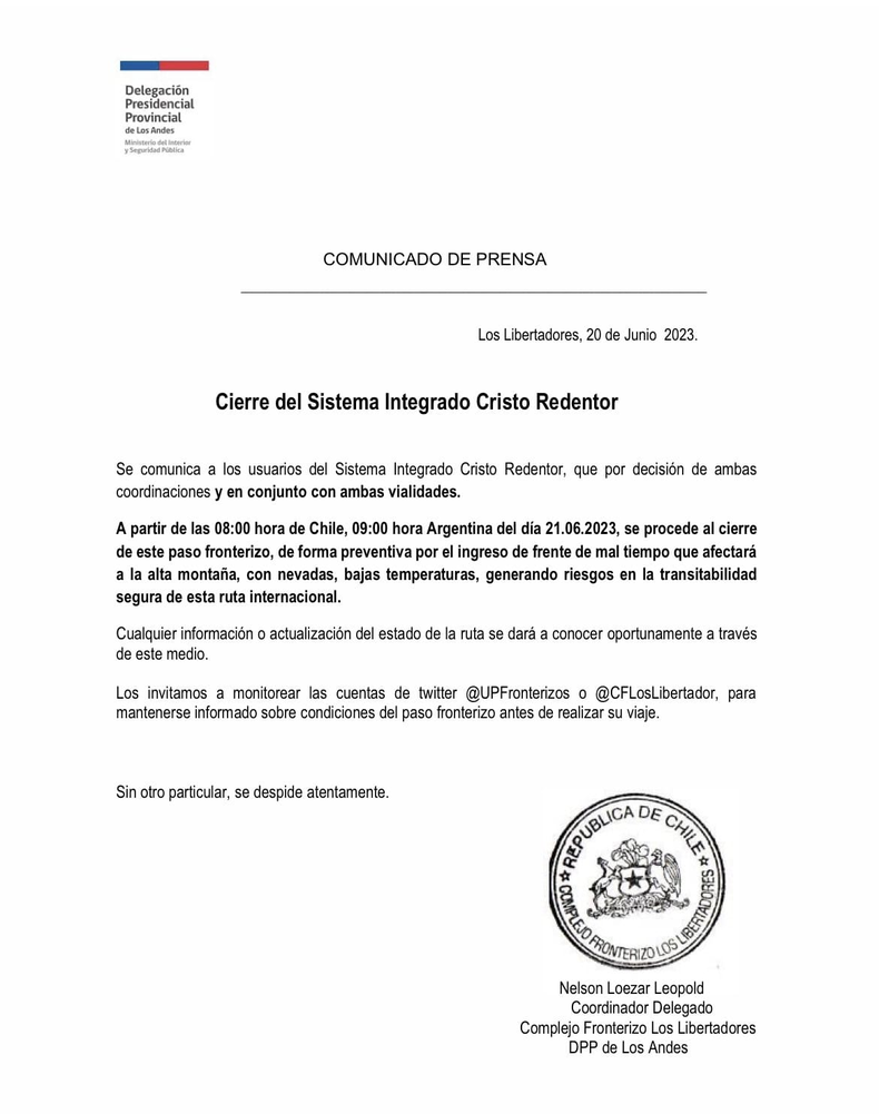 Las dos dependencias encargadas del tránsito fronterizo, en Chile y en Argentina, decidieron que, desde este miércoles 21 de junio a las 8 hora chilena, y a las 9 hora argentina, se cierre al tránsito el Paso Cristo Redentor.