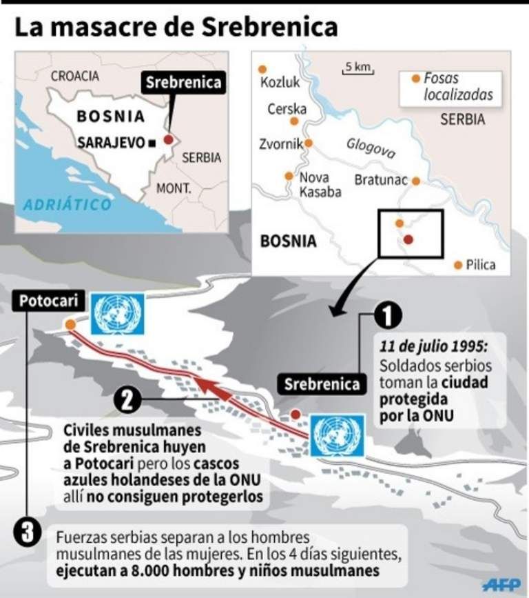 La masacre de Srebrenica, el capítulo más oscuro en la Europa de posguerra, se remonta a al verano boreal de 1995, cuando después de casi tres años de asedio, el general serbobosnio Ratko Mladic ordenó el ataque final contra 40.000 civiles musulmanes de la ciudad (en Bosnia oriental), de los cuales la mitad eran refugiados de los alrededores en esta zona declarada "protegida por la ONU".