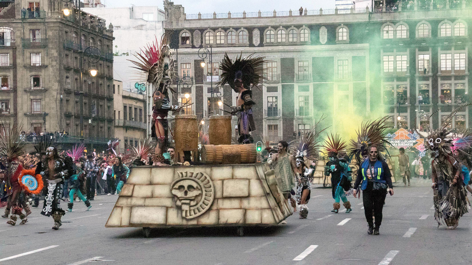Con las caras alzadas y un brillo de entusiasmo en los ojos, los asistentes al desfile, al fin, ven pasar los carros alegóricos, las mojigangas, las marionetas y las catrinas gigantes que evocan las almas de todos aquellos que han migrado, en particular a Ciudad de México. El primer carro, justamente, alude a la fundación de Tenochtitlán, a la cavidad del pasado prehispánico y al origen de los grandes desplazamientos migratorios en el Valle de México. Arcos, colibríes y la marcha de los primeros hombres y mujeres llegados de Aztlán, escenifican la mítica migración azteca.