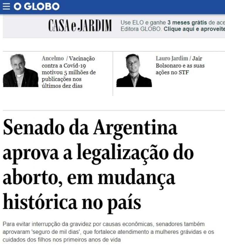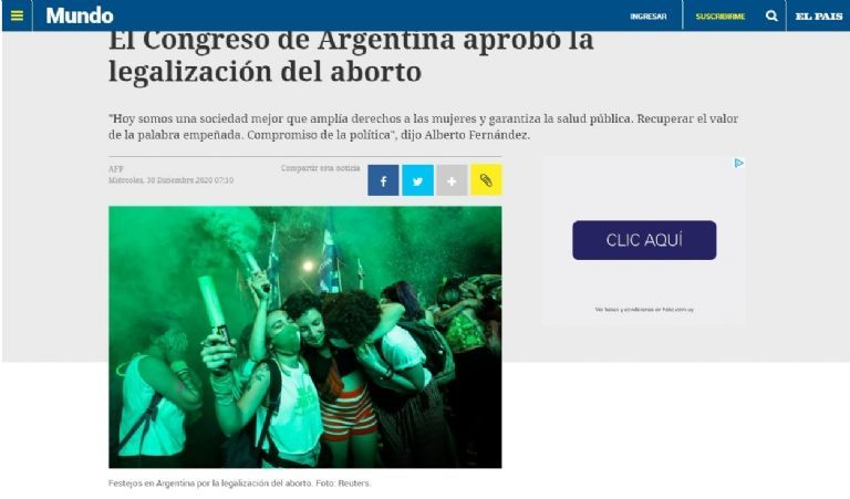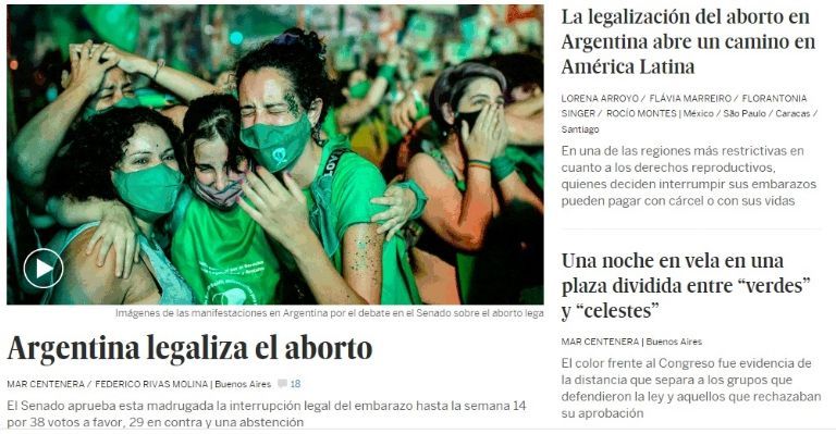 "Argentina vuelve a situarse a la vanguardia de los derechos sociales en América Latina. Desde este miércoles es el primer país grande de la región en permitir que las mujeres decidan sobre sus cuerpos y si quieren o no ser madres, como ya hicieron antes Uruguay, Cuba, Guyana y Guayana francesa."