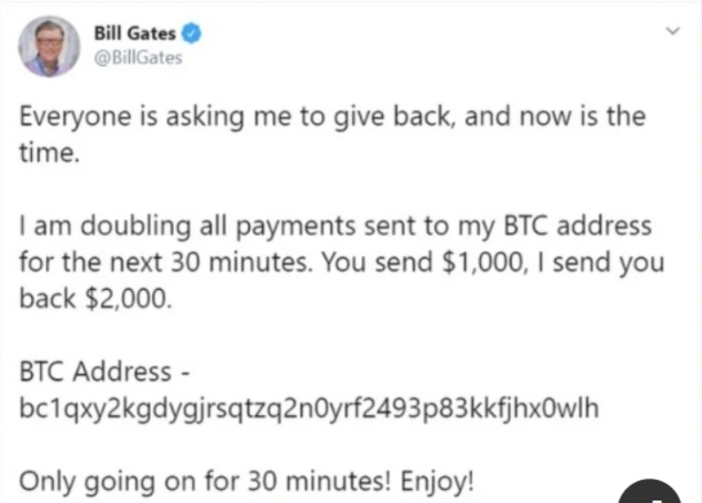 Los estafadores alentaron a la gente a enviarles bitcoins con la promesa de devolverles el doble. Los mensajes, que fueron en su gran mayoría borrados, aparecieron en las cuentas oficiales de varios famosos. En los textos se le decía a la gente que tenía 30 minutos para enviar u$s1.000 dólares en bitcoin y se les devolvería el doble.