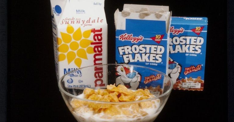 Un tazón de cereal con leche, una caja de leche y dos cajas de cereales.