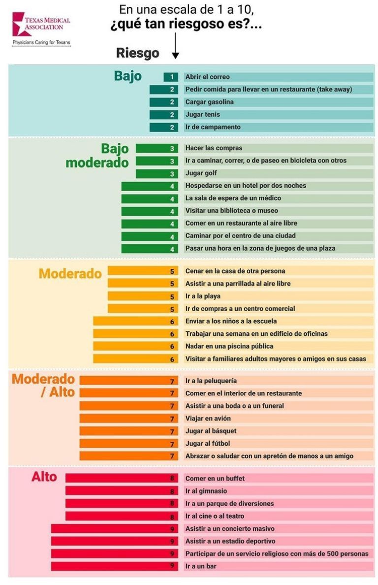 La Asociación Médica de Texas elaboró un listado con las actividades que conllevan un mayor riesgo a la hora de entrar en contacto con el virus SARS-CoV-2, responsable de causar la enfermedad COVID-19, que tiene hace ocho meses en vilo al mundo entero.