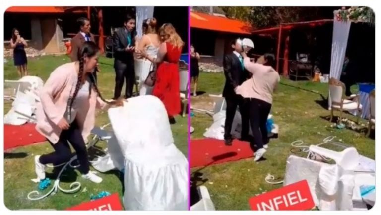 Sí señora, esta escena parece salida de telenovela. La mujer aparece en la boda e indignada por lo que estaba viendo, destrozó todo lo que estaba a su paso, frente a la vista de todos los invitados y el juez que estaba a punto de casa a la pareja. Los fotógrafos y camarógrafos hicieron lo suyo, ya que registraron el momento.