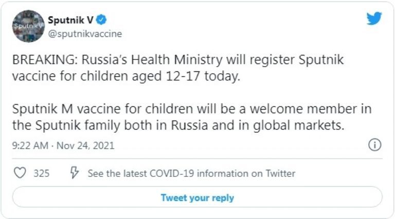“El Ministerio de Salud de Rusia registrará hoy la vacuna Sputnik para niños de 12 a 17 años”, indicaron sus desarrolladores en la cuenta oficial de Twitter