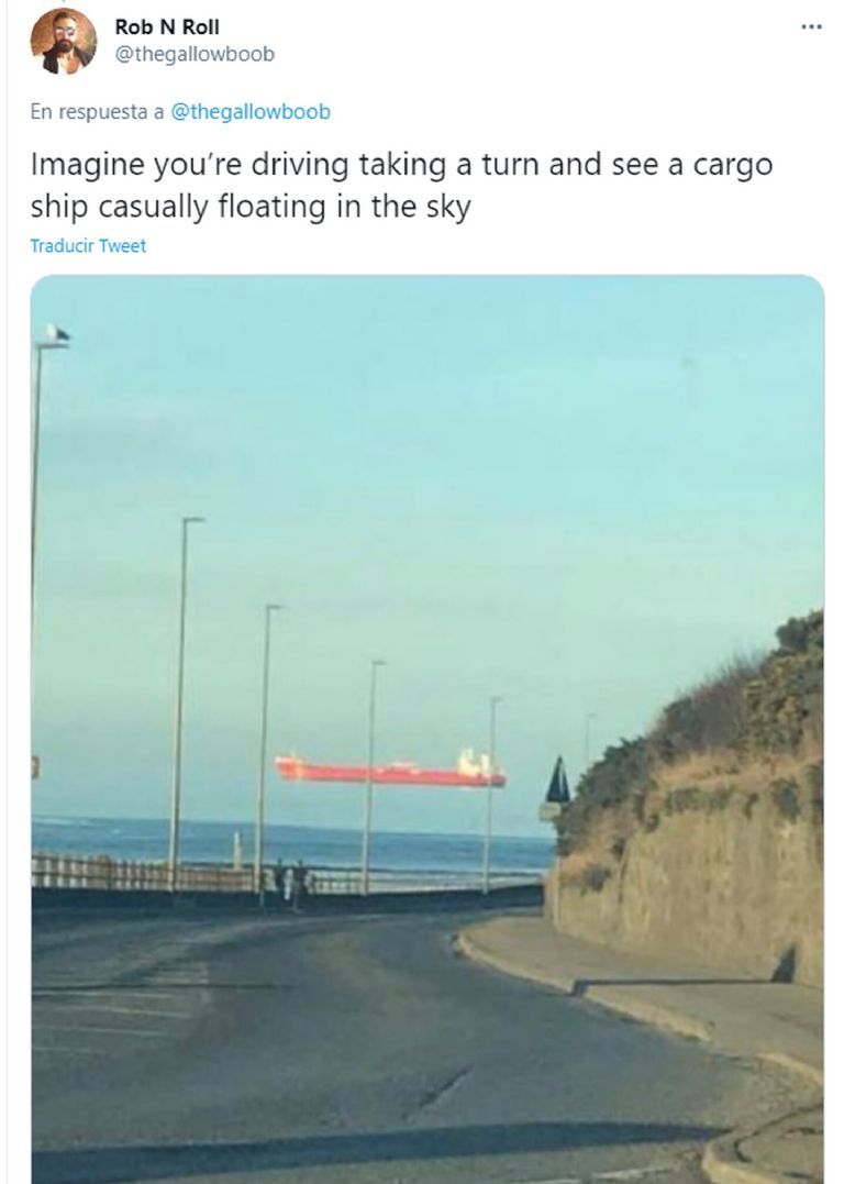El usuario en Twitter @thegallowboob fue quien compartió las fotos del fenómeno: “¿Alguien vio un barco flotando sobre el horizonte? No, es falso. Los meteorólogos explican que los espejismos superiores a menudo aparecen debido a los cambios de temperatura. El aire frío, al ser más denso que el aire caliente, distorsiona la distancia con la que aparecen los objetos en la línea del horizonte”, escribió como descripción de las imágenes.