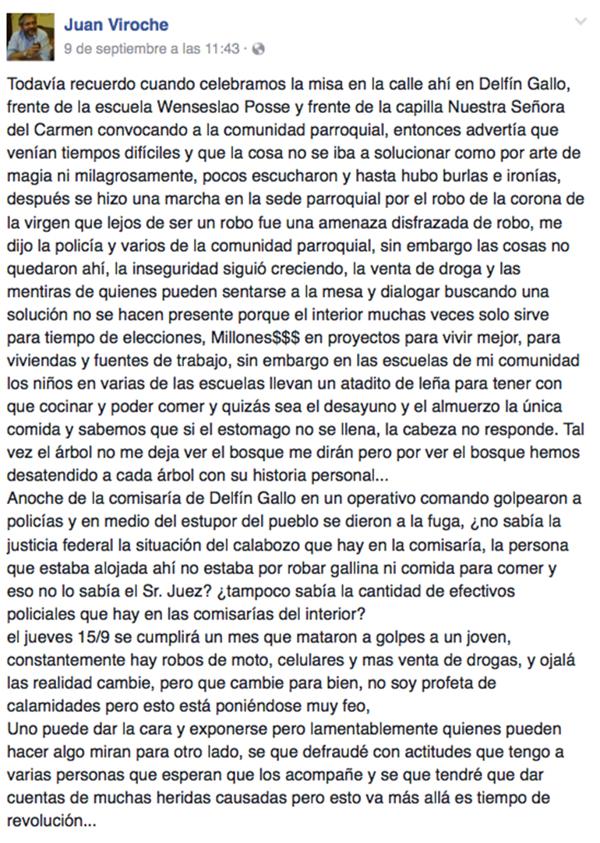 Pero Viroche vivía amenazado. En varias oportunidades encabezó las marchas del pueblo para denunciar el avance del narcotráfico y la criminalidad. Los vecinos comentaron que el sacerdote les había manifestado su intención de alejarse porque su vida corría peligro.