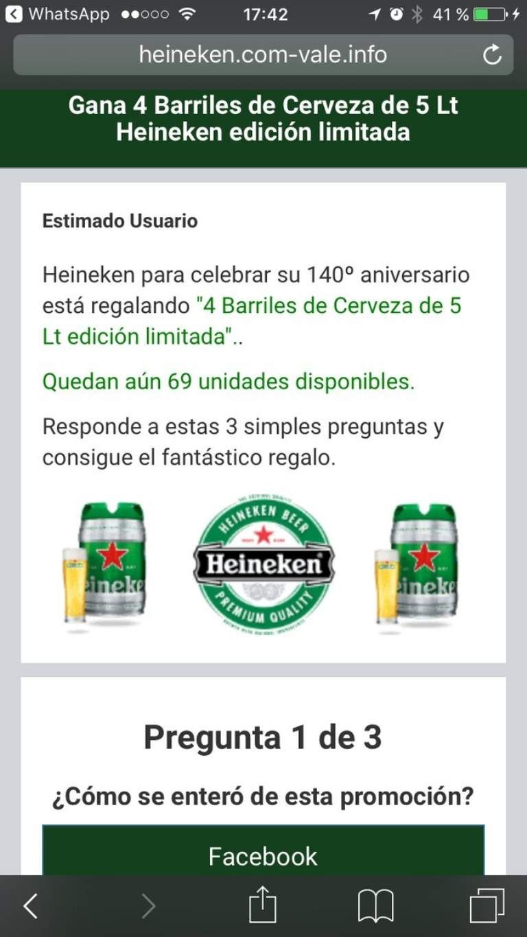 Para acceder a este beneficio de Heineken, una de las cervecerías de renombre mundial, solo hay que ingresar en un link que supuestamente, al clickearlo, llevará directo a obtener la recompensa.