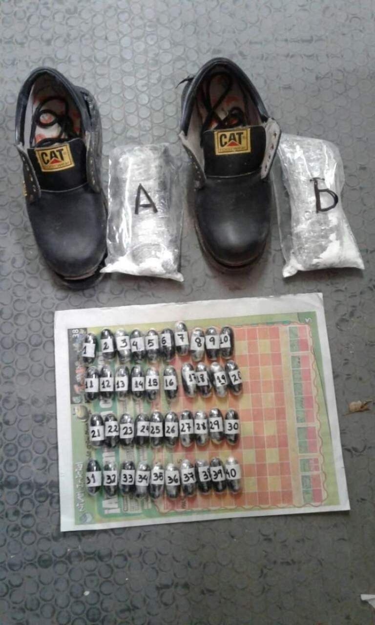 Debido a que los uniformados notaron contradicciones en los dichos y actitudes sospechosas en los traficantes, se pasó a una requisa en la que descubrieron dentro de la mochila del hombre 40 cápsulas de cocaína y otros paquetes similares debajo de las plantillas de los zapatos.