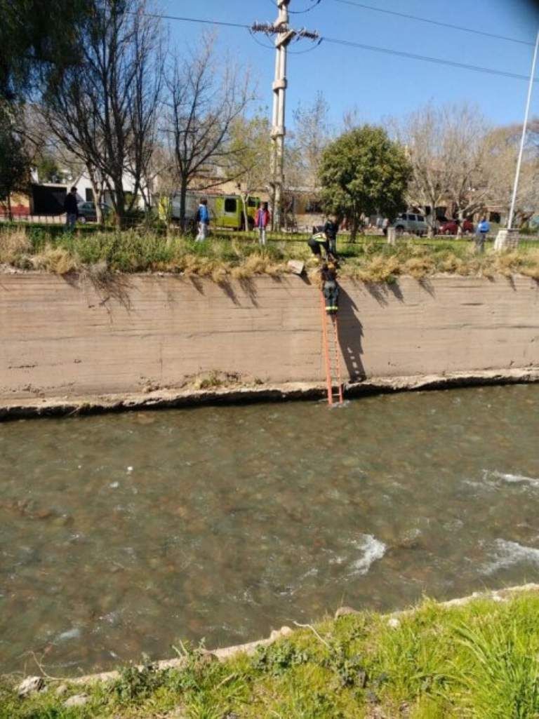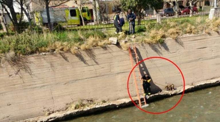 El cuerpo de rescatistas realizaron un procedimiento para salvar a un perro que había caído al canal Cacique Guaymallén a la altura de Peltier casi Figueroa Alcorta de ese departamento.