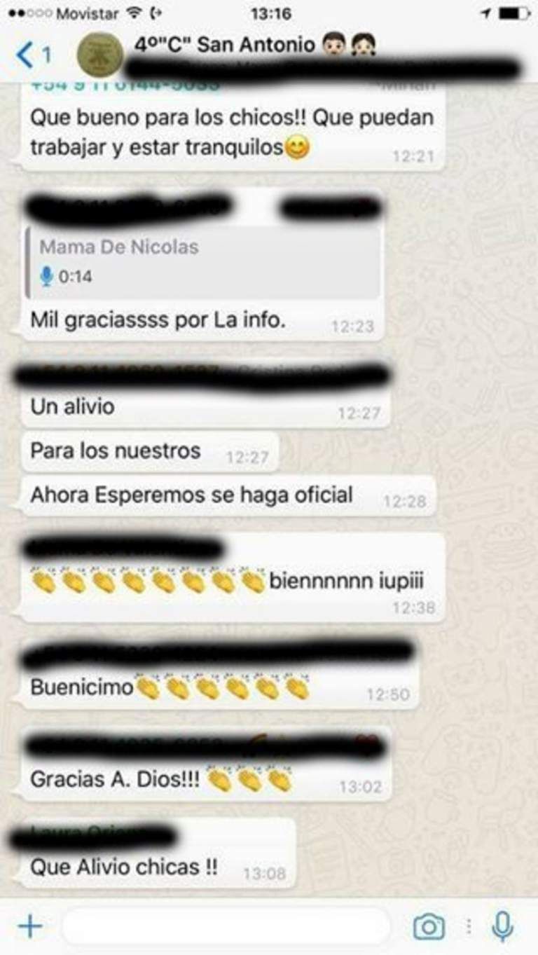 “Al fin una buenísima noticia. Era hora de que se hicieran valer los derechos del niño para 35 y no para uno solo”, opinó una de las mamás por WhatsApp y acompañó su texto con emoticones de aplausos, fiesta y brindis, según el posteo compartido por Gómez en Facebook. “Ojalá sea una buena noticia para ese nene y una buena noticia para todos los que peleamos para que nuestros hijos tengan una primaria como se merecen”, aseguró otra. “Qué bueno para los chicos, que puedan trabajar y estar tranquilos”, se sumó una tercera. “Un alivio para los nuestros”, dijo una cuarta mujer al respecto.