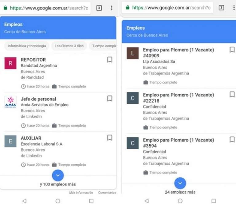 A partir de ahora, tanto en computadoras de escritorio como en dispositivos móviles, al buscar términos como "trabajos cerca de mí", "trabajos para docentes" o consultas similares relacionadas a búsquedas laborales, aparecerán resultados detallados que permitirán explorar trabajos disponibles en la web.