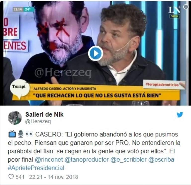 Invitado al programa Terapia de Noticias que se transmite en LN+, el actor dijo: "Tenemos adelante un gobierno con el culo pesado, con el pecho frío, al que le importa tres carajos y nos ha abandonado a todos los que le pusimos el pecho".