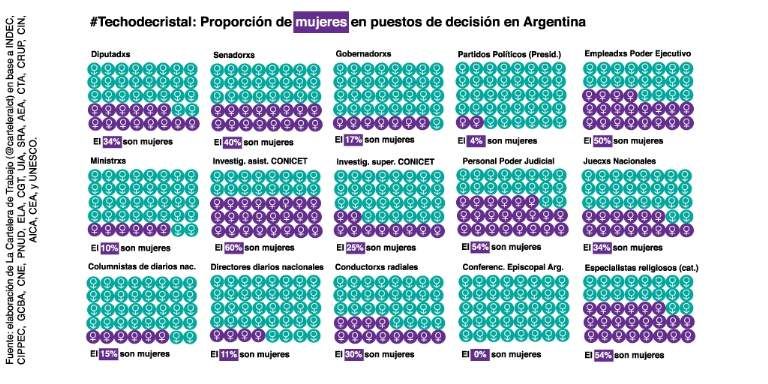 En el CONICET se ve claramente como incluso en ámbitos donde predominan las mujeres, los puestos de decisión están controlados por varones. De los más de 9.000 investigadores del CONICET, un 52% son mujeres, uno de los niveles más altos de los países relevados por UNESCO. Argentina también tiene uno de los niveles más altos de mujeres graduadas de doctorados, un 62% del total. Sin embargo, solamente un 25% de lxs investigadores superiores del CONICET son mujeres, mientras que para lxs investigadorxs asistentes dicha proporción alcanza el 60%.