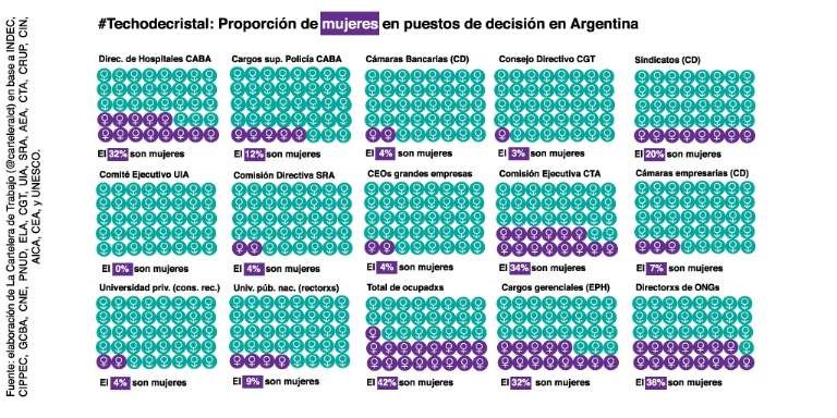 Según el informe ya citado de ELA, las mujeres ocupan 4,4% de los máximos cargos ejecutivos (CEO, Presidente/a, Director/a General) de las grandes empresas, listadas como las 1000 empresas con la facturación más alta en 2009 según la Revista Mercado. Solamente 7% de los miembros de las comisiones directivas de cámaras empresarias son mujeres.