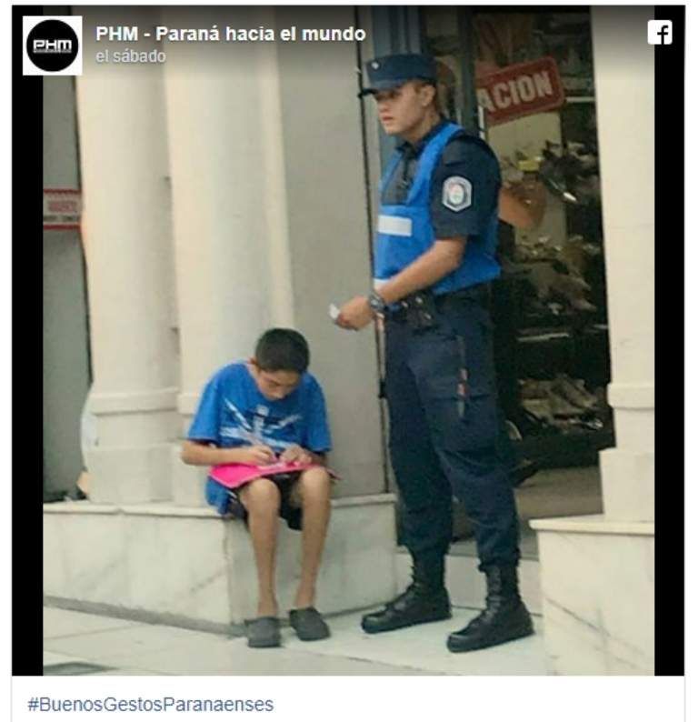 Un transeúnte de Paraná, en Entre Ríos, fotografió el momento en el que un policía de su ciudad ayudaba a estudiar a un niño en la calle. Publicó la imagen en Facebook y tomó gran repercusión entre los usuarios.