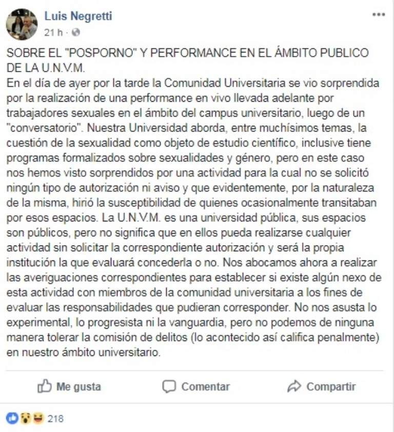 Según el rector, los dos actores (un hombre y una mujer) eran trabajadores sexuales y “no tendrían ningún vínculo con la Universidad”. Sin embargo, reconoció que “esa gente de afuera no viene si alguien de adentro no la invita o no está articulado de alguna manera con algún miembro de la comunidad universitaria”.