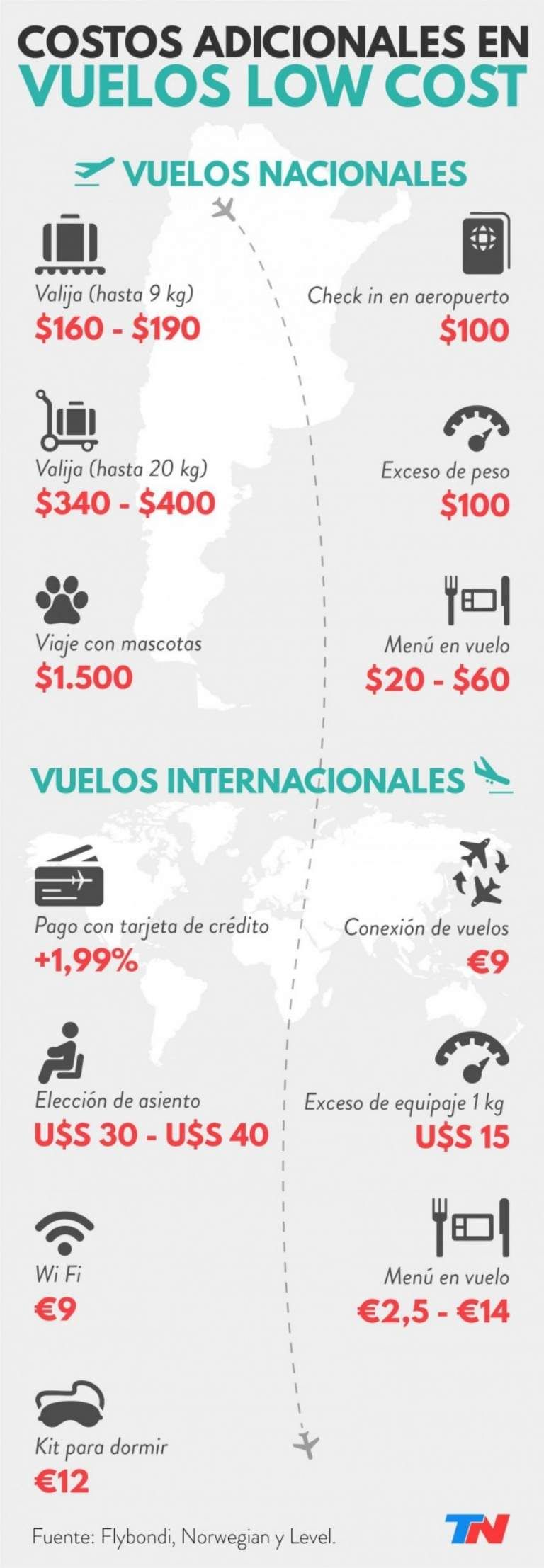Por ejemplo, en el caso de FlyBondi cobra por separado importes por equipajes o para elegir los asientos. Además para comer algo en el vuelo ofrece productos por precios de entre 20 y 60 pesos.