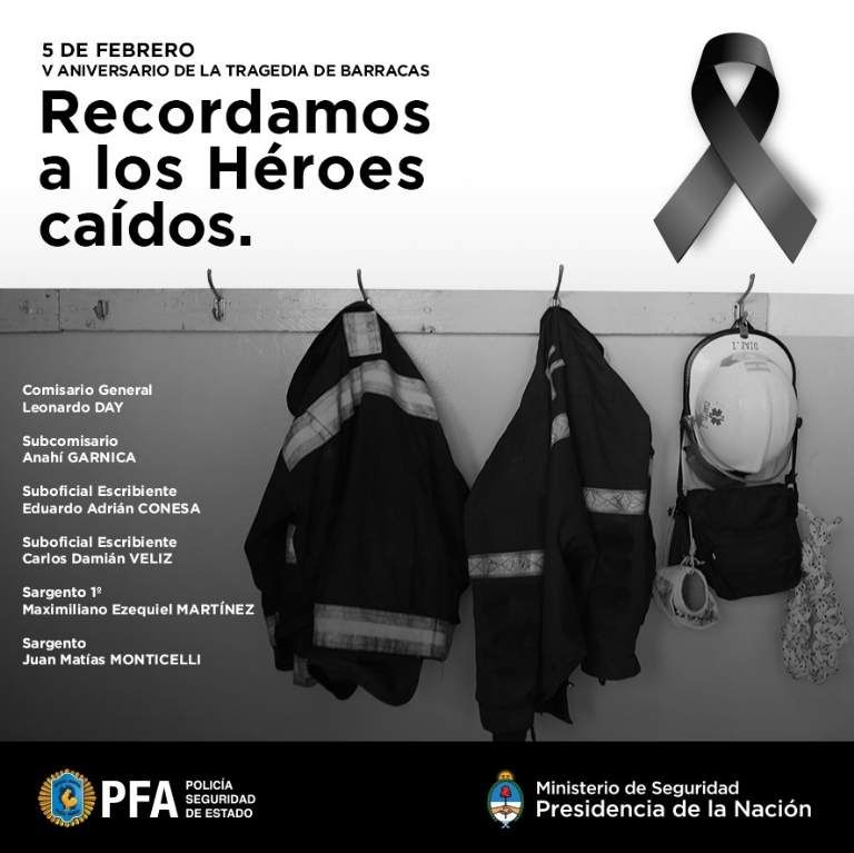 La Policía Federal Argentina rindió homenaje, en todo el país, a los héroes de la Superintendencia Federal de Bomberos caídos en el cumplimiento del deber en el siniestro de Barracas, al conmemorarse hoy el quinto aniversario del trágico hecho.
