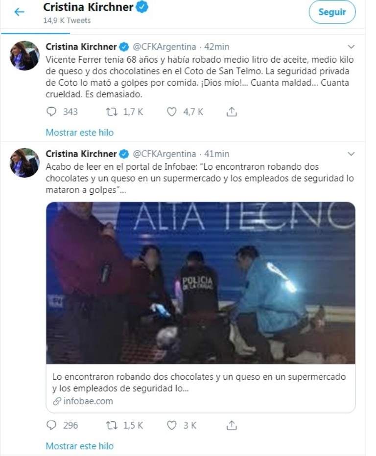 La senadora de Unidad Ciudadana, Cristina Fernández de Kirchner, se manifestó en su cuenta de Twitter sobre el asesinato de un anciano que fue golpeado por guardias de seguridad del supermercado Coto de San Telmo, al que acusaban de robar dos chocolates, una botella de aceite y medio kilo de queso.