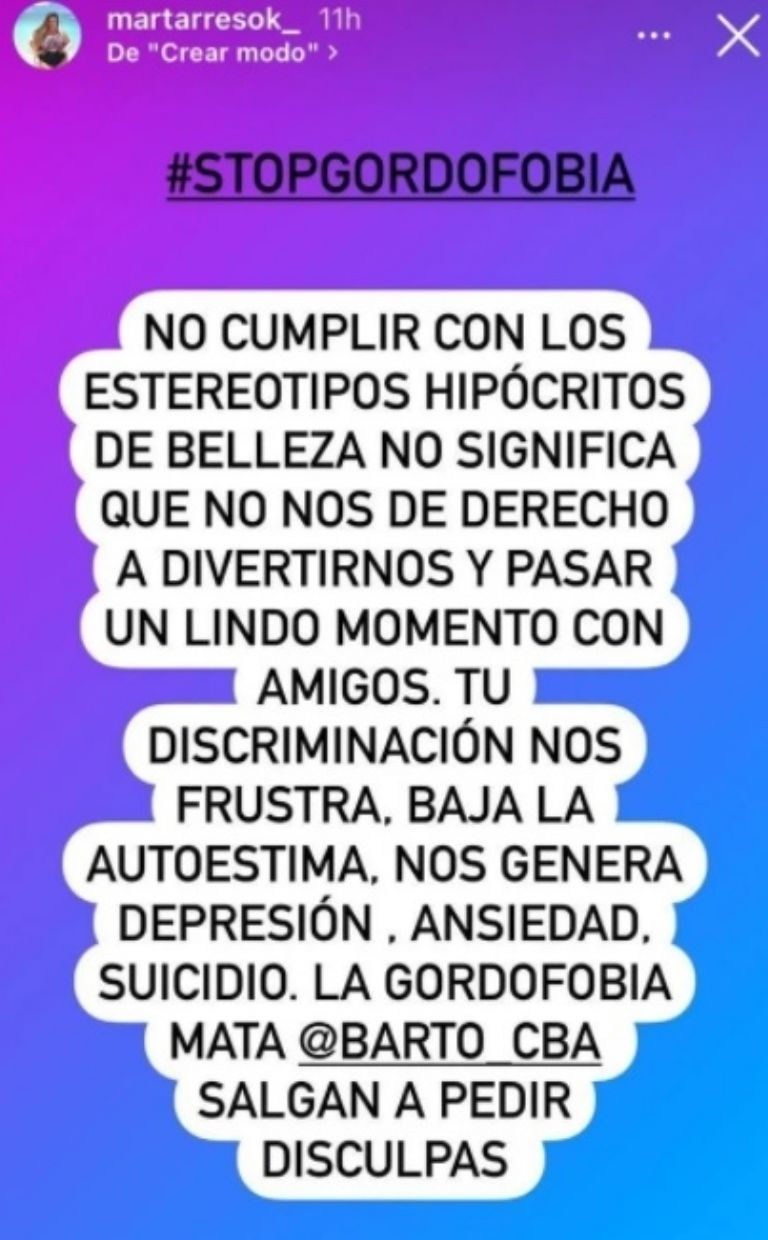"Me dicen que esto ocurrió en Bartó, vayan a darle mucho 'amor' a su página. Una vez, un impresentable dijo que soy quilombera por denunciar a los boliches que discriminan, yo le llamaría mejor 'justiciera'", escribió Tarrés en una storie de su cuenta de Instagram.